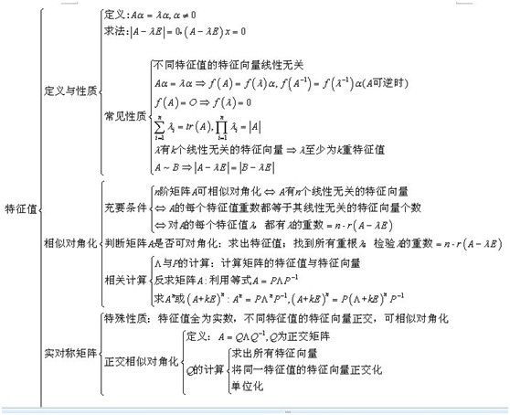 说明:特征值与特征向量是线性代数的又一重要考点,考试对这一部分的要求可以大致分为三点:一是直接考查特征值特征向量的定义与性质,二是对矩阵相似对角化的条件以及相关计算的考查,三是对实对称矩阵特殊性质的考查。