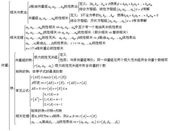 说明:向量的概念较为抽象,对考生逻辑推理能力要求较高,是线性代数的难点之一。向量的考点大致可以分为两部分:一是向量的线性表出与线性相关,二是秩的概念及相关公式。复习这一部分时,关键是正确理解基本的概念并掌握它们与其他章节(尤其是线性方程组)之间的联系。