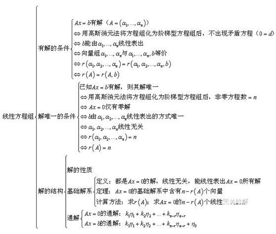说明:线性方程组是线性代数前半部分的理论核心,也是后半部分的基础,重要性不言而喻。线性代数的主要考点可以分为三部分:线性方程有解的条件(有没有解),有唯一解的条件(有多少解),解的结构(通解的表示)。对这三个问题从不同层面的回答串联起了整个学科的理论体系。