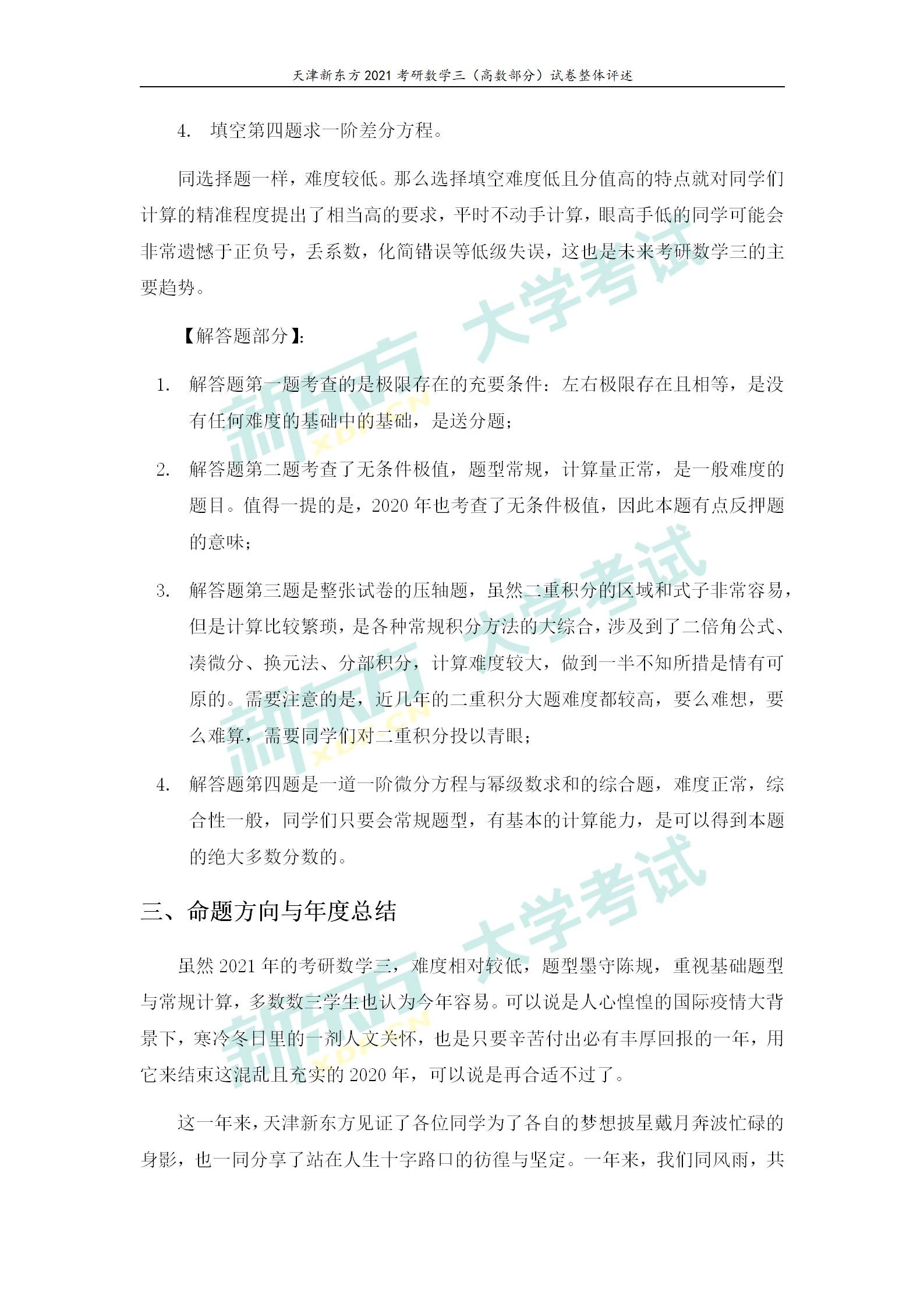 2021考研数学三(高数部分)试卷整体评述(天津新东方)