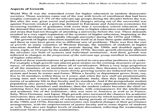 (50)High growth rates increased the chances for academic innovation; they also weakened the forms and processes by which teachers and students are admitted into a community of scholars during periods of stability or slow growth.