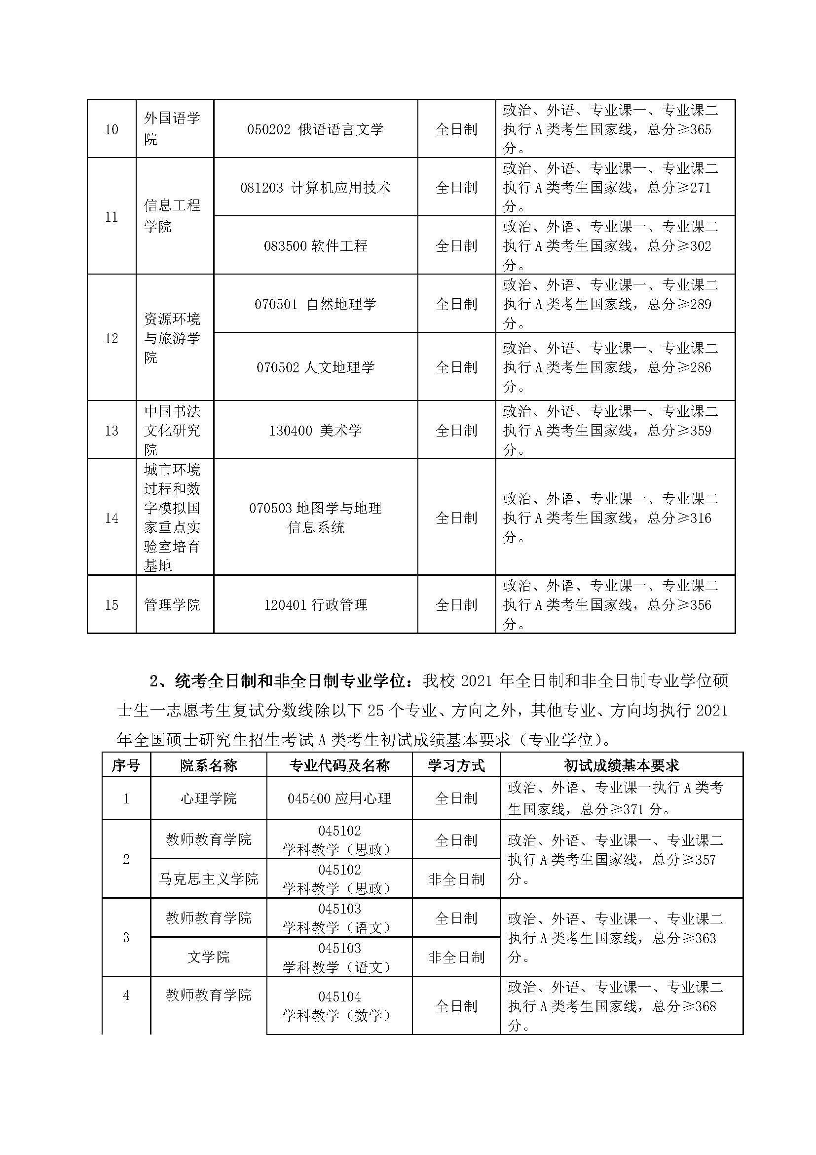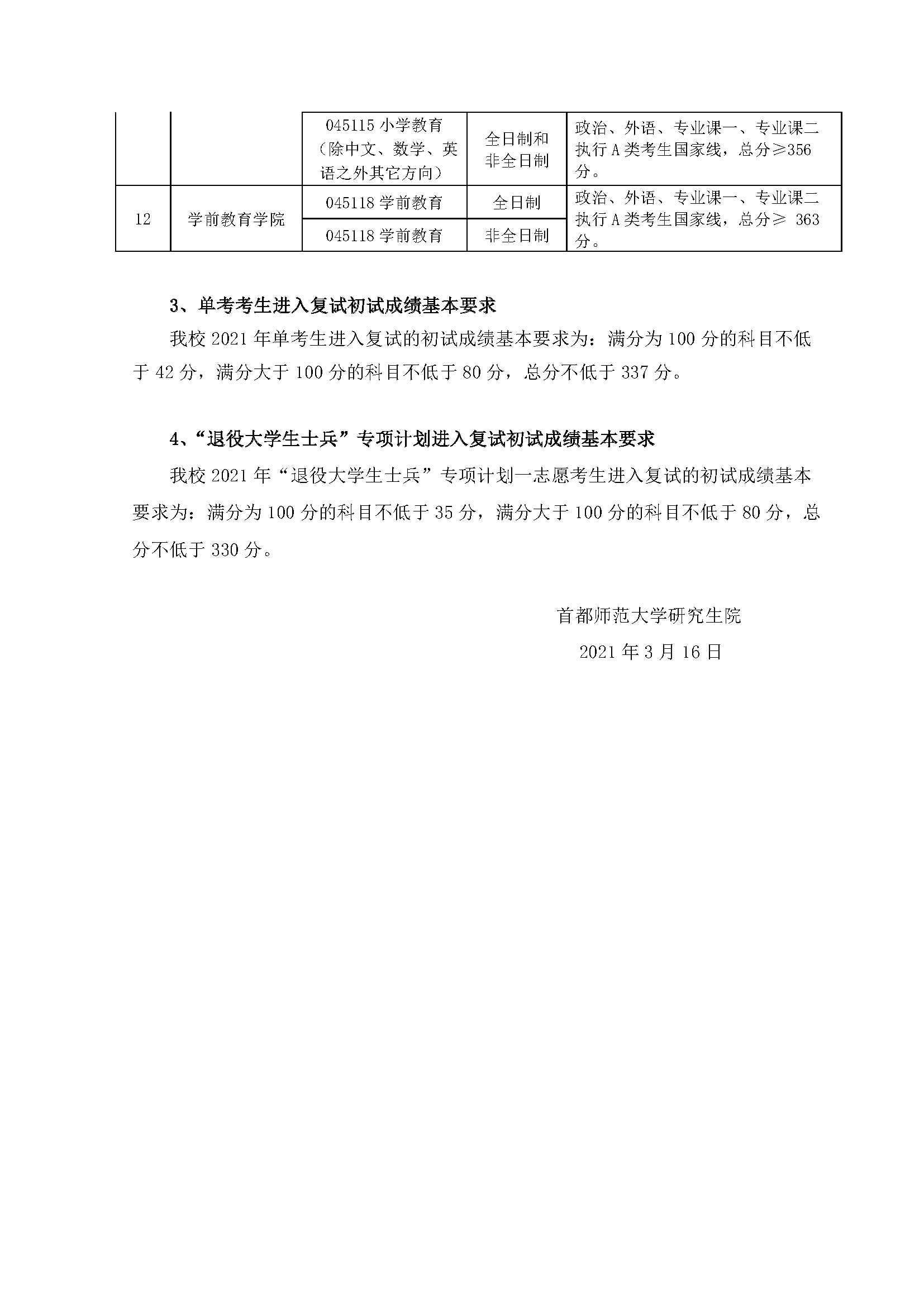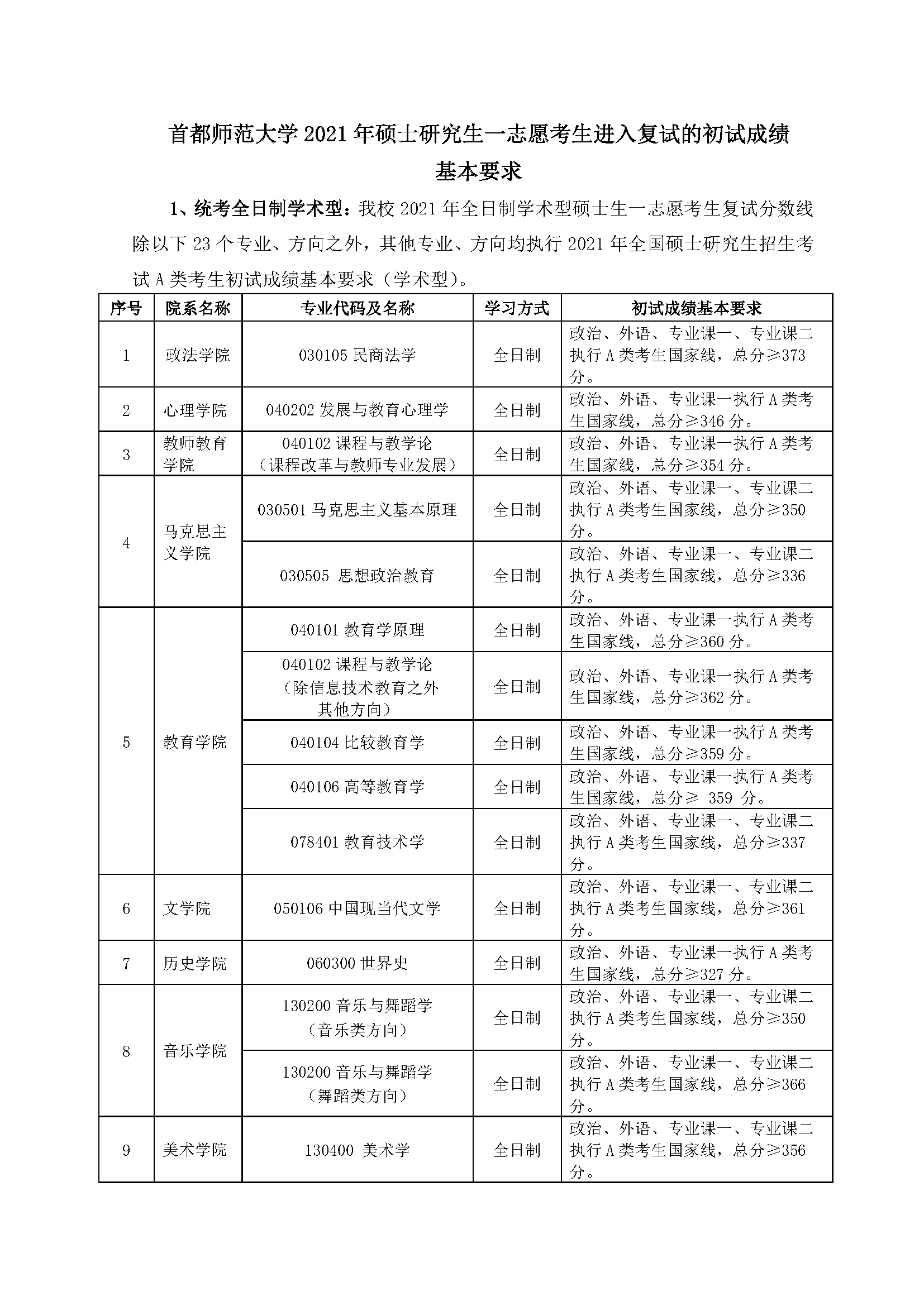 首都师范大学2021年硕士研究生一志愿考生进入复试的初试成绩基本要求