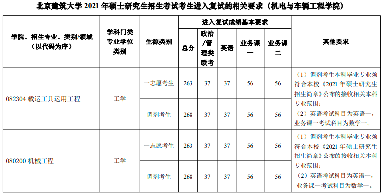 北京建筑大学2021年硕士研究生招生考试考生进入复试的相关要求(机电与车辆工程学院)