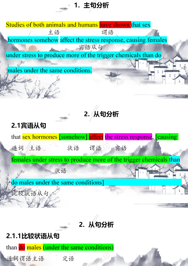 ①Studies of both animals and humans have shown that sex hormones somehow affect the stress response, causing females under stress to produce more of the trigger chemicals than do males under the same conditions.
