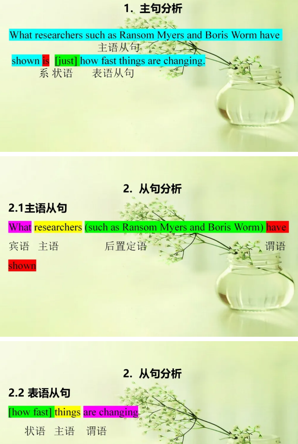 ⑤(并列:分3)根据他们在《自然》杂志上发表的最 新论文,一个新的渔场在被开发后的 15 年中大型捕食动物的生物量平均减少了 80%。