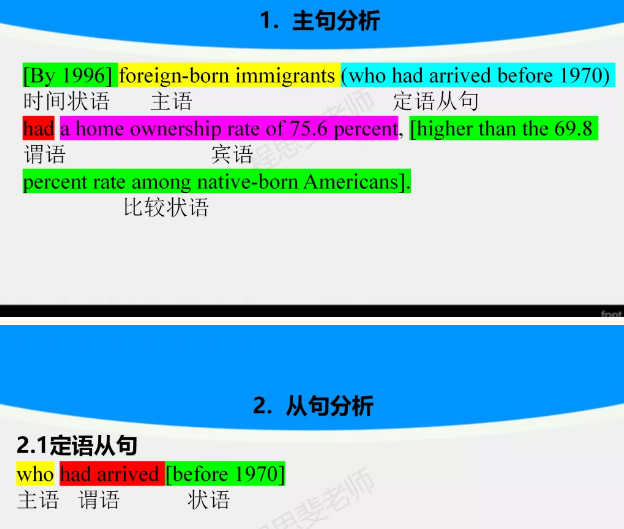 ①(例1:分1)1990 年的人口普查结果显示,“来自十五个最主要移民国的移民大多数在居住十年后英语讲得‘不错’或‘非常好’。”