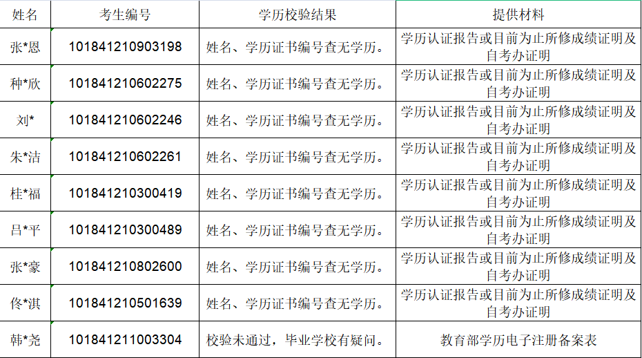 请以下考生学历校验未通过请于3月23日至3月26日间根据要求上传相关材料以及往电子邮箱发送相关材料(标题:xljy+姓名+考生编号)