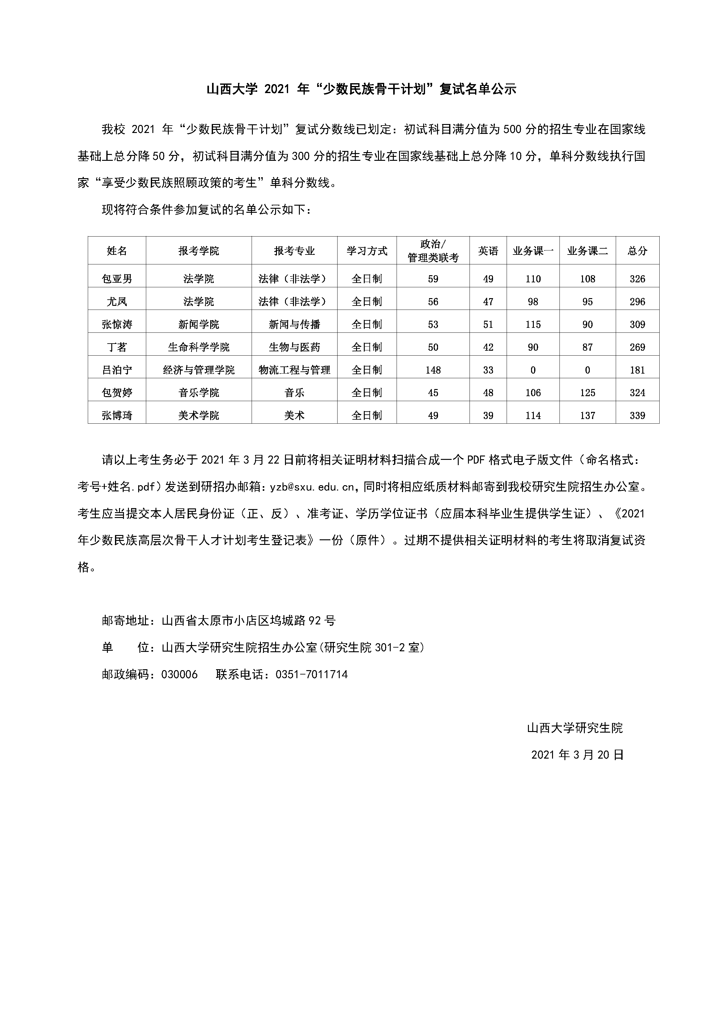 山西大学2021年“少数民族骨干计划”复试名单公示