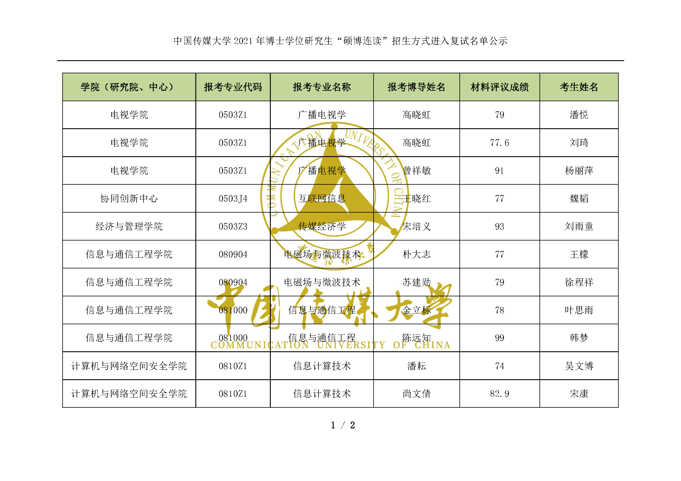 中国传媒大学2021年博士学位研究生“硕博连读”招生方式进入复试名单公示