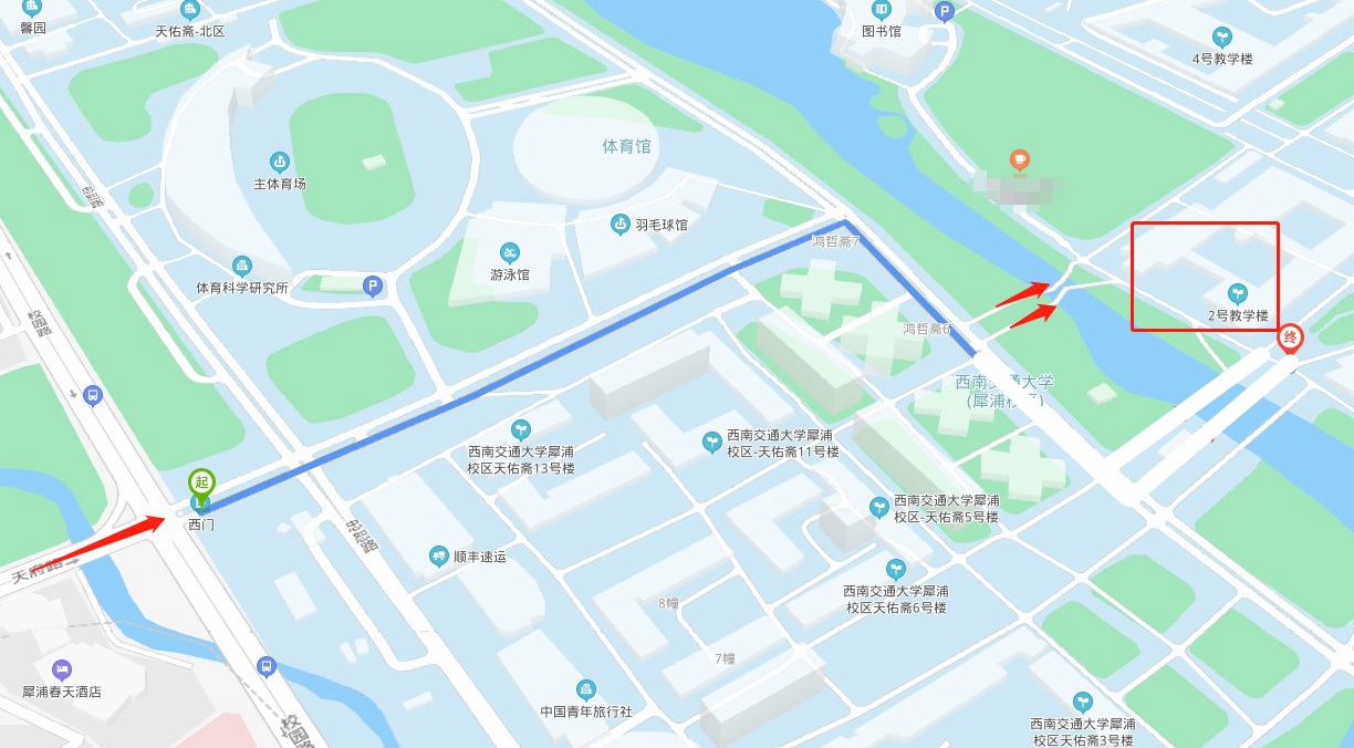 1.考生进入学校后,按道路指示牌指引前往考场。正常情况下,从学校西门到考场教学楼步行约需15分钟。(下图红色箭头为从西门前往考场行进方向,箭头所在的蓝色线条是到考场的路线,沿途有指示牌指引)