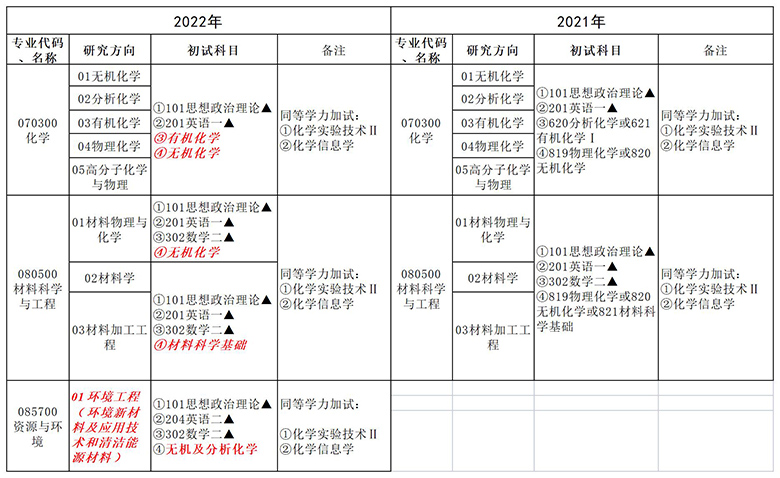 根据研究生培养需要,我院化学、材料科学与工程、资源与环境专业2022年硕士研究生招生初试科目及报考条件调整如下: