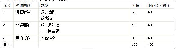 本考试包括以下部分:词汇语法、阅读理解、英语写作等。总分为 100 分。