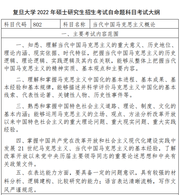 2022复旦大学考研招生自命题科目802当代中国马克思主义概论考试大纲(下载)