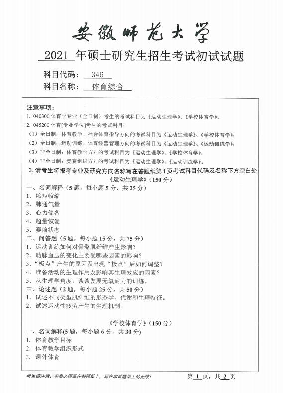 2021安徽师范大学346体育综合考研初试真题(下载)
