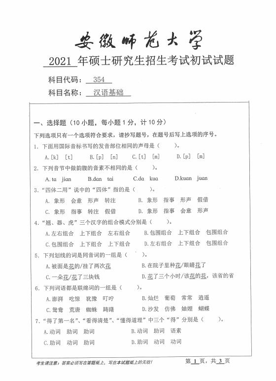 2021安徽师范大学354汉语基础考研初试真题(下载)