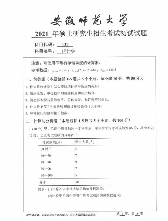 2021安徽师范大学432统计学考研初试真题(下载)