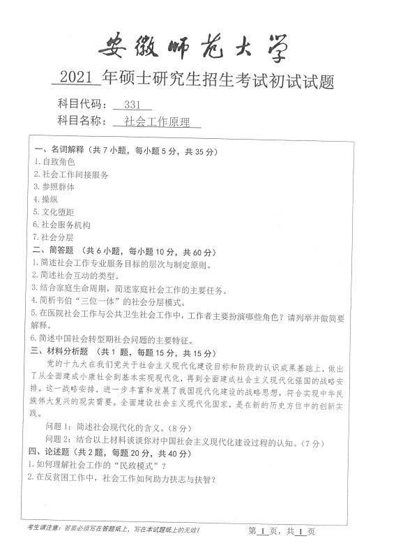 2021安徽师范大学331社会工作原理考研初试真题(下载)