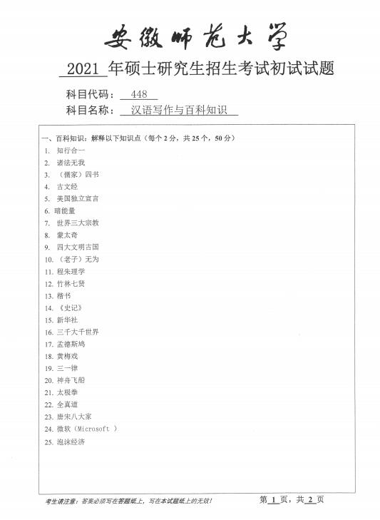 2021安徽师范大学448汉语写作与百科知识考研初试真题(下载)
