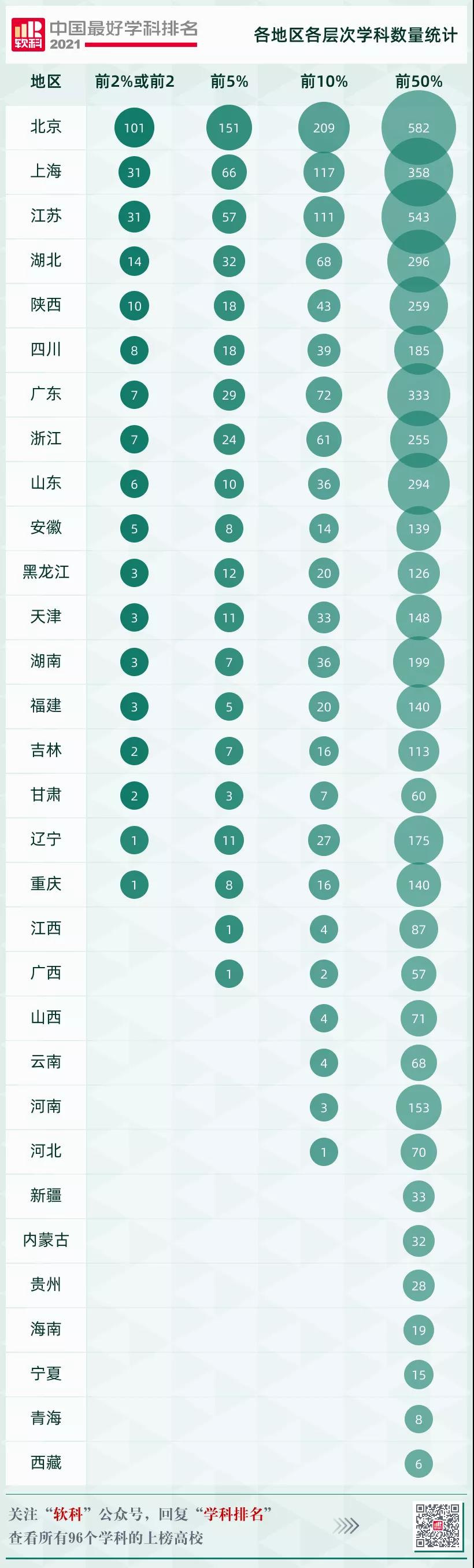 从各省级行政区的上榜学科数量分布看,北京占据绝对优势,在各层次的学科数都高居全国第一。上海的前2名或前2%学科数、前5%学科数、前10%学科数均位列全国第二,顶尖学科数量优势明显。江苏的前50%学科数位列全国第二,前2名或前2%学科数并列全国第二,彰显了雄厚的整体实力。湖北、陕西、四川等省的顶尖学科数量都处于国内前列。广东、浙江、山东的上榜学科总数优势明显。