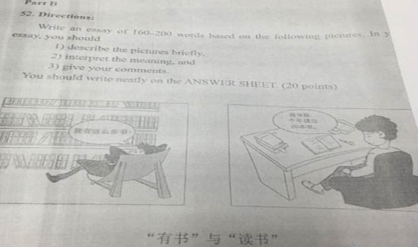 对于图片的描述,很多同学可能会简单地叙述为:A boy says“I have so many books.”, while another boy makes his mind to finish 20 books this year. 这样的叙述虽然语法上是正确的,但是没办法让句子变得丰富,所以我们可以给本句话中的名词添加短语作定语。比如boy后面可以添加定语,定语的方向可以观察人物的状态,图片中男孩的状态是lying in a sofa lazily with a crossing legs. 同理,另外一个男孩的状态就可以描述为who is so absorbed in his book. 这样经过调整,本句就可以调整为:A boy lying in a sofa lazily with a crossing legs says“I have so many books.”, while another boy who is so absorbed in his book makes his mind to finish 20 books this year. 最终,这个句子不管从字数上还是句式难度上,都更加出彩。