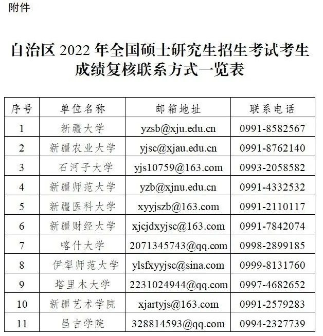附件:自治区2022年全国硕士研究生招生考试考生成绩复核联系方式一览表