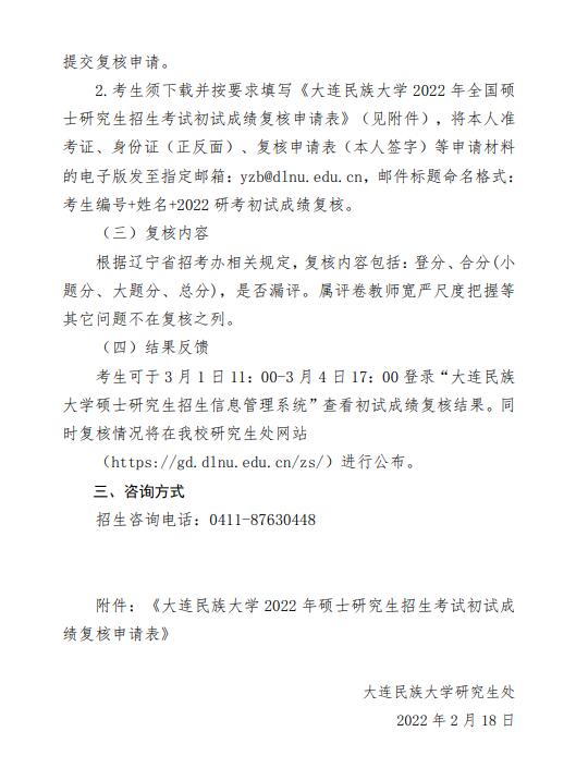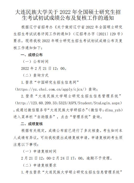 大连民族大学关于2022年全国硕士研究生招生考试初试成绩公布及复核工作的通知
