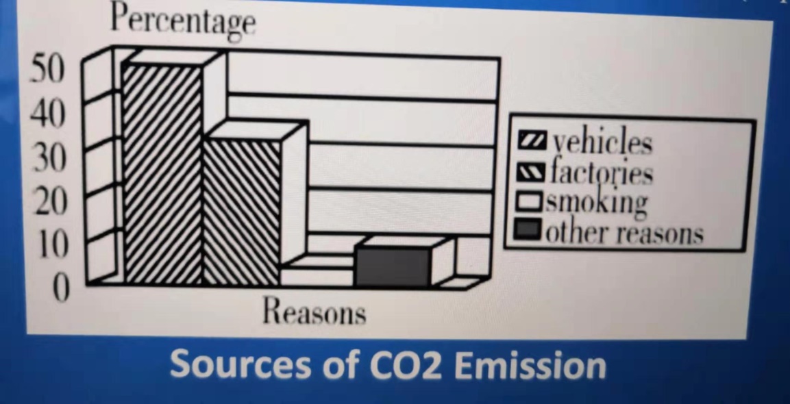 The bar chart depicts the sources of CO2 emission in the air. The main contributor is vehicles, accounting for 50%. The CO2 emission from factories takes up approximately 35%. While the minor contributor is smoking, which occupies 5% or so.
