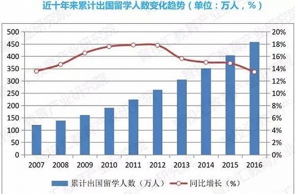 As is evidently demonstrated in the chart above, the 10 years between 2007 and 2016 have witnessed some remarkable changes with regard to the statistics of Chinese students studying abroad. To be concrete, the number of Chinese students to pursue a further study in other countries experienced a steady gain of 3.3 million, from roughly 120 million in 2007 to approximately 450 million in 2016. Meanwhile, the growth rate also ascended stably in the first 6 years and reached its peak in 2012, and since then that began to decline gradually.