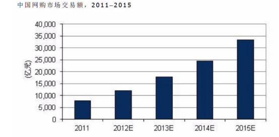 上图中明确展示的是2011-2015年国内市场网上购物的销售变化。电子商务的营业额从2011年的约8000亿大幅增长到2014年的25000亿。出人意料的是,预计2015年这一数字将继续大幅飙升至约34000亿。