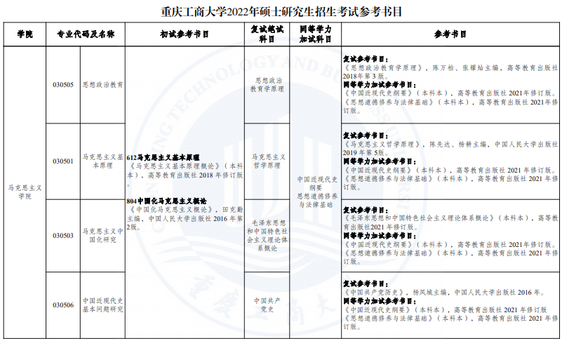 考研专业课参考书目每年可能都会有变化,考生需要持续关注这方面的消息。为方便各位考生及时获取考研各招校各专业的参考书目信息,小编特整理了相关内容,一起来看“2022重庆工商大学考研参考书目:马克思主义学院”,供大家参考。