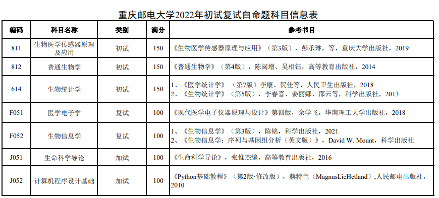 考研专业课参考书目每年可能都会有变化,考生需要持续关注这方面的消息。为方便各位考生及时获取考研各招校各专业的参考书目信息,小编特整理了相关内容,一起来看“2022重庆邮电大学考研参考书目:生物信息学院”,供大家参考。