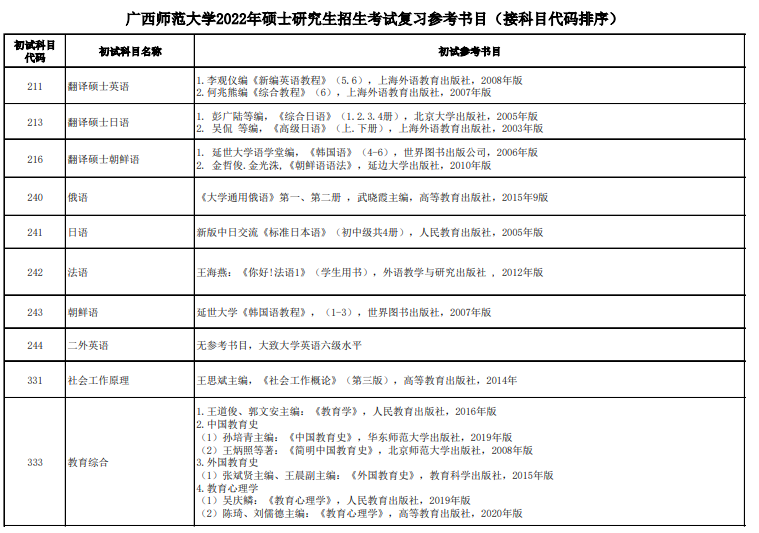 考研专业课参考书目每年可能都会有变化,考生需要持续关注这方面的消息。为方便各位考生及时获取考研各招校各专业的参考书目信息,小编特整理了相关内容,一起来看“2022广西师范大学考研参考书目”,供大家参考。