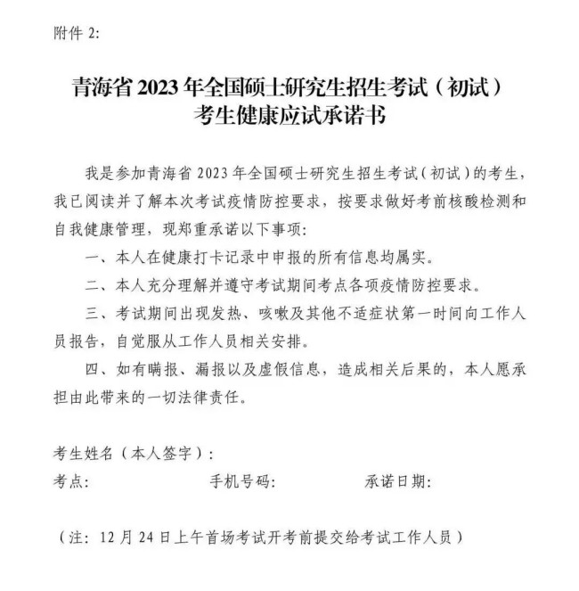 考试首日首场考试开考前,所有考生须提交《青海省2023年全国硕士研究生招生考试(初试)考生健康应试承诺书》(详见本公告附件2)和12月21日所做核酸检测结果截图打印件(须本人签字),并自觉接受考务工作人员查验。
