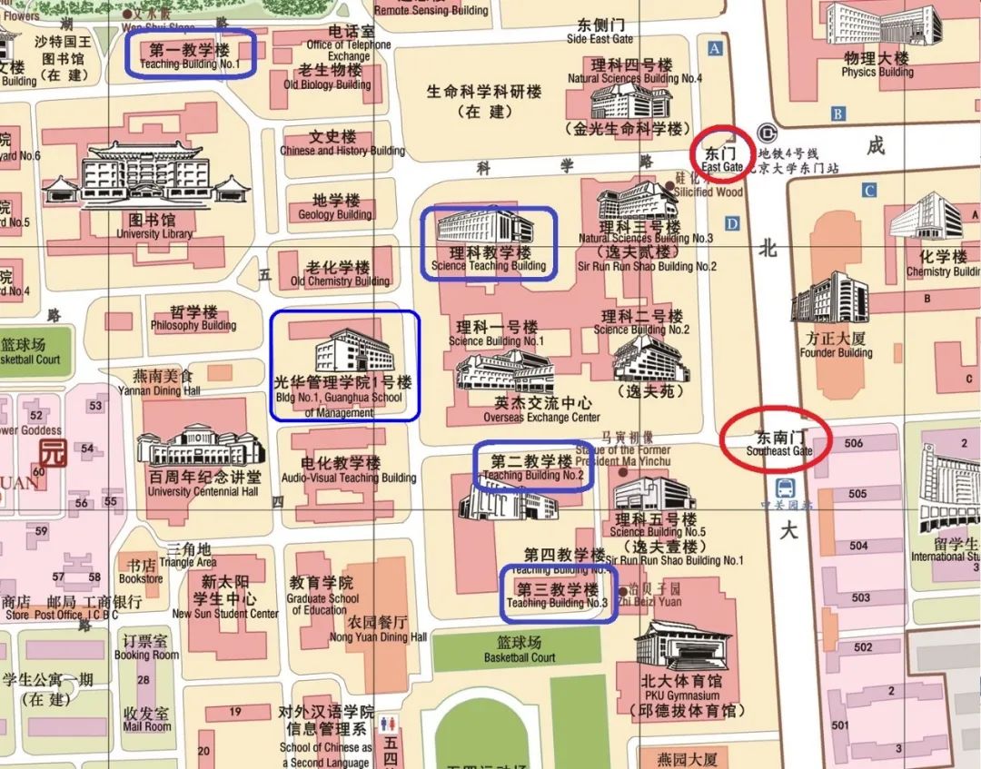 考试当天,校本部将为考生开放东门和东南门作为入场通道。考生务必提前到达指定校门,开考15分钟后不得进入考点。在校本部第一教学楼和理科教学楼参加考试的考生,建议从地铁4号线北京大学东门站A口出,由东门进入校园;在校本部第二教学楼、第三教学楼参加考试的考生,建议从地铁4号线北京大学东门站D口出,由东南门进入校园。