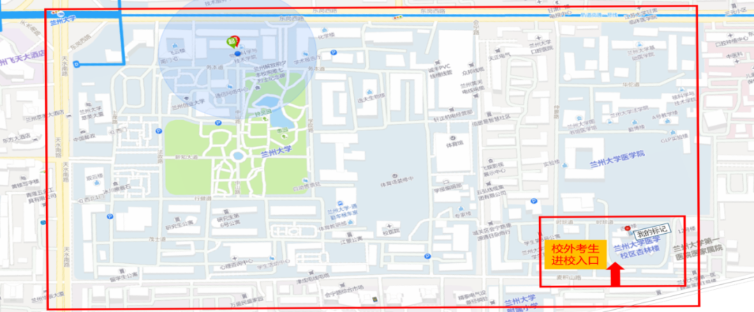 2.校外考生凭准考证、有效身份证件等从城关校区东区南门(麦积山路),通过直达杏林楼一楼东侧校外考生考场的专用通道到达杏林楼指定候检区排队等候,其他要求同校内考生。