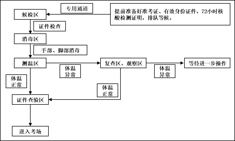所有考生考试当天须佩戴N95或KN95口罩,凭准考证、有效身份证件进入考点。首场考试时,考点查验考生“72小时核酸检测阴性证明”并测量体温,其他场次不再查验。