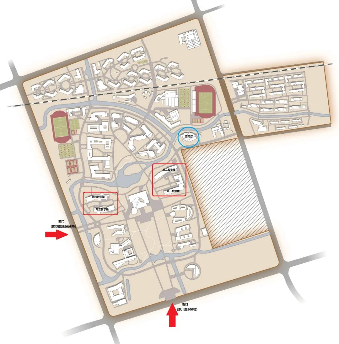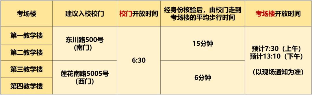 考试当日早6:30起校门开放,考生须佩戴医用外科口罩或以上级别口罩,从闵行区东川路500号(南门)或莲花南路5005号(西门)(特殊考场区的考生将通过“研招网站内信”等渠道另行告知),凭本人有效居民身份证原件、核酸报告,经体温测量正常(<37.3°)后,进入校园。若两次测量体温>37.3℃,将在指定专用的应急考场参加考试,不要慌张,现场工作人员会安排。