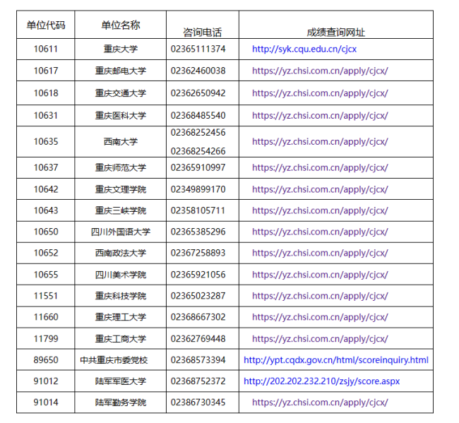 注:报考重庆市外招生单位的考生,请根据报考单位或其所在省教育考试机构公布的时间及方式查询成绩。