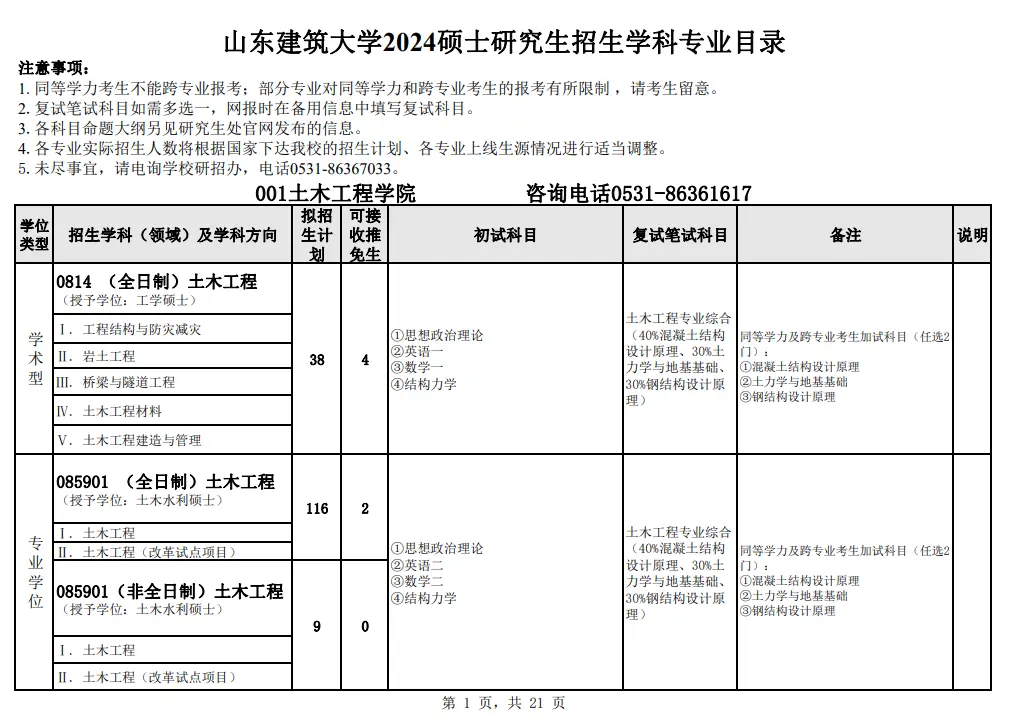 2024年山东建筑大学研究生招生专业目录及考试科目
