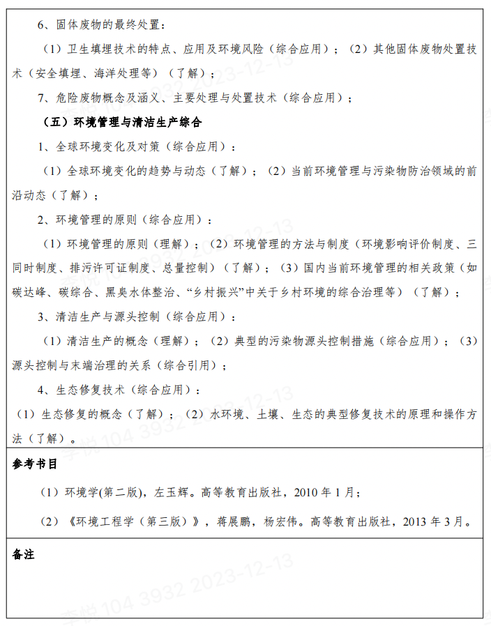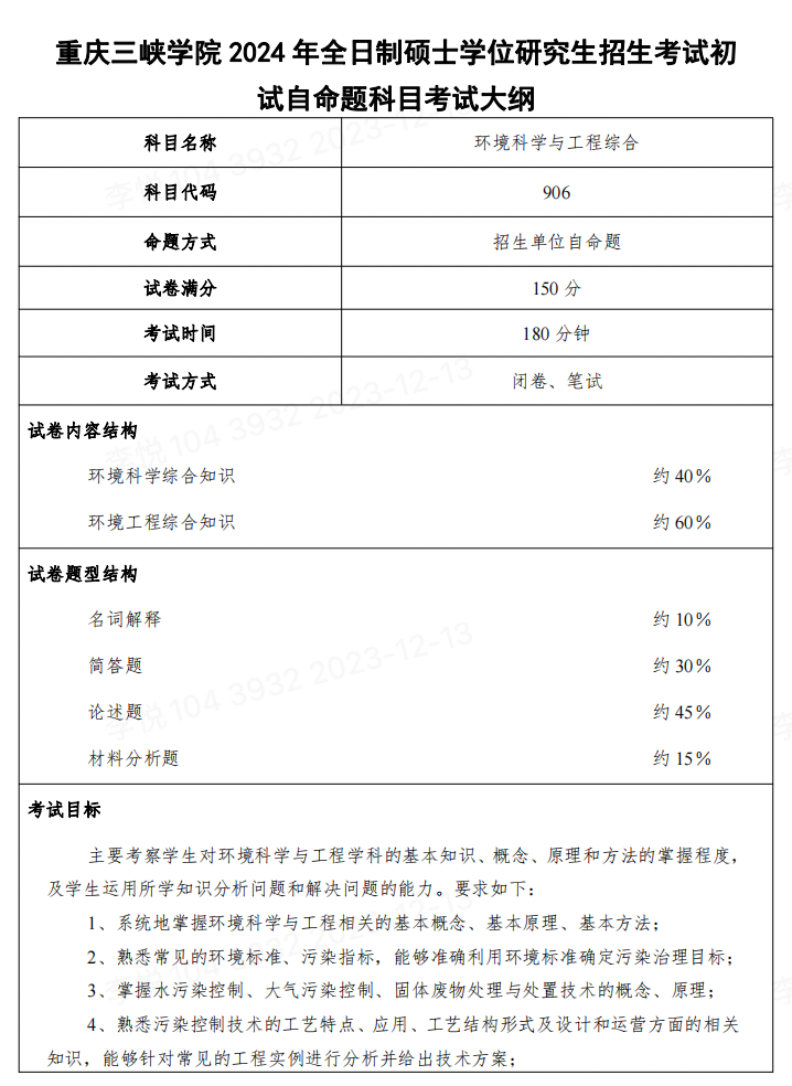 2024年重庆三峡学院考研考试大纲:906环境科学与工程综合