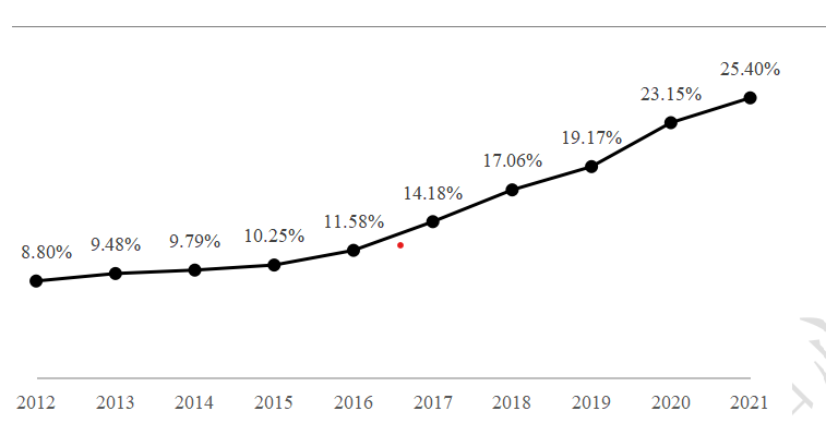 ThelinechartvividlydepictsthechangeinChineseresidents’healthliteracylevelfrom2012to2021.Healthliteracy,whichreferstopeople’sabilitytoaccessbasichealthcareinformationandservices,andtopromotetheirhearthconditionbasedonthem,seemstohaveahighercoveragethan10yearsage.Theproportionofthosewithadequatehealthliteracyamongallresidentsagingfrom15to69haskeptgrowingstablyinthelastdecade.In2012,thenumberwas8.8%,butwhenitcomesto2021,itreached25.4%,whichisagoodnewsforallresidents.