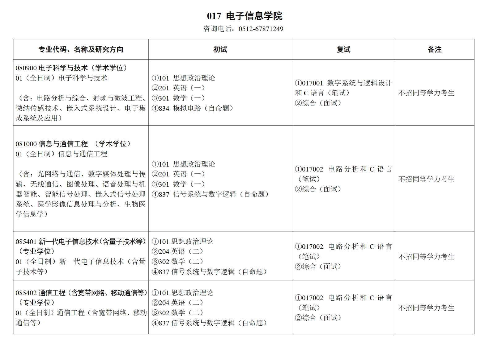 苏州大学2024年电子信息学院研究生招生专业目录已公布!