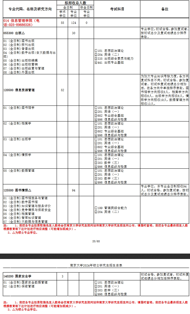 南京大学2024年信息管理学院研究生招生专业目录已公布!