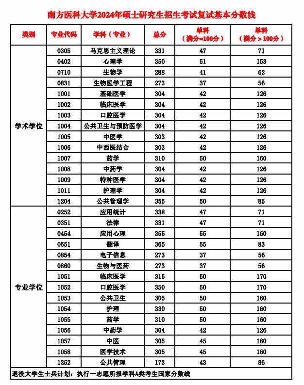 2024年南方医科大学硕士研究生招生考试复试基本分数线已公布,主要内容包括:各专业总分、单科(满分=100分)基本分数线、单科(满分>100分)基本分数线等。