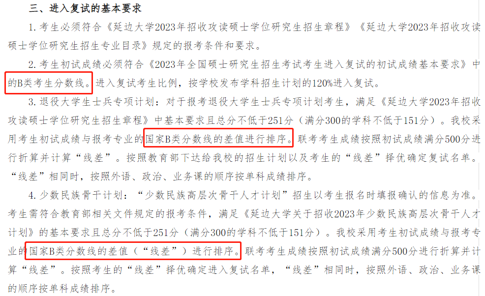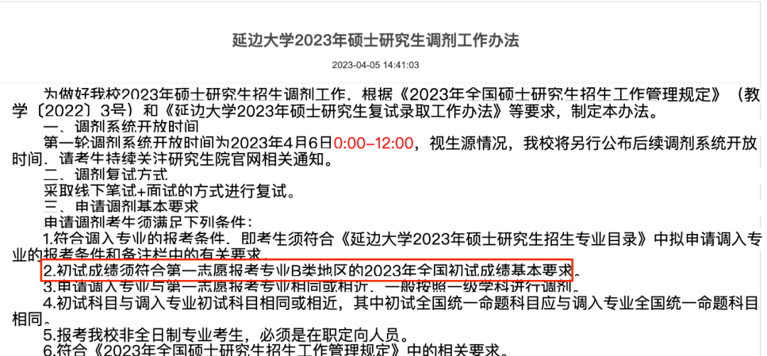而延边大学2023年考研调剂公告中,对校内调剂及校外调剂的分数要求也是:满足国家线B类线!