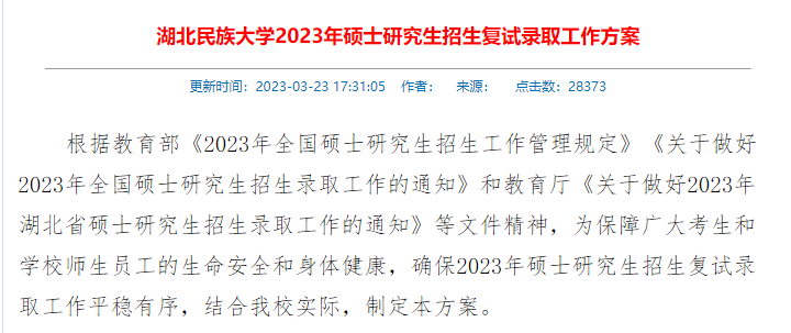 《湖北民族大学2023年硕士研究生招生复试录取工作方案》中,复试资格确定的第一条内容为:参加复试的考生必须达到教育部规定的《2023年全国硕士研究生入学考试考生进入复试的初试成绩基本要求》B类考生分数线。