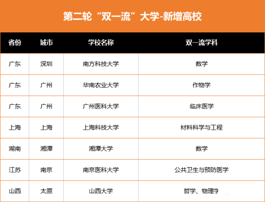 2022年2月14日,教育部公布第二轮双一流建设高校及建设学科名单,新增7所高校。
