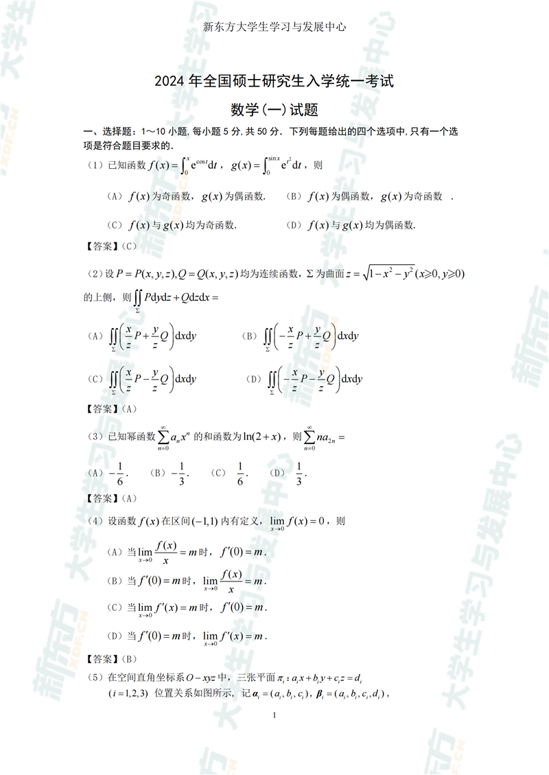 考研真题可以帮助考生在备考过程中了解考试内容和题型、把握考试难度和命题规律、检测学习效果和水平,从而提高应试的方法和经验。因此,新东方为同学们提供了2024数学一考研真题及答案解析,希望可以帮助到大家。