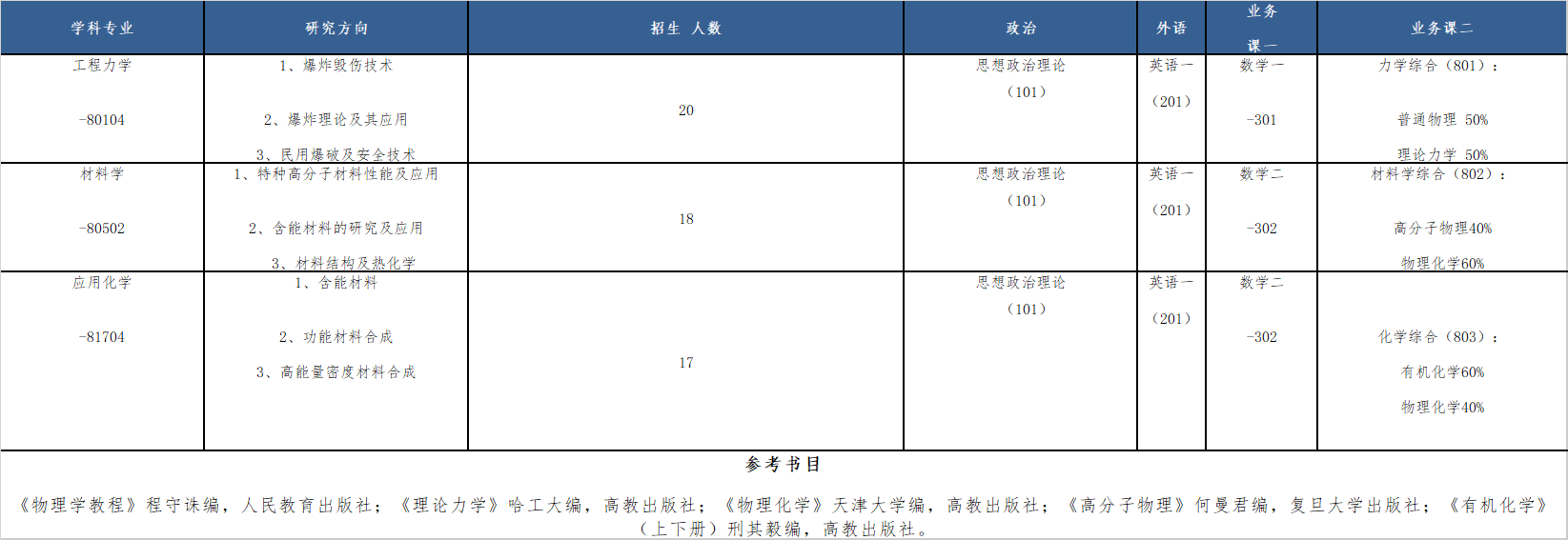 研究所是以含能材料、功能材料、特种化工材料开发及工程力学应用研究为主的多学科综合性研究机构,涉及的专业学科主要包括化学、化学工程与技术、应用化学、材料科学与工程、高分子材料、动力工程及工程热物理、航空宇航科学与技术、兵器科学与技术、机械工程、机械设计、力学、工程力学、流体力学、发动机设计、飞行器设计、测试计量技术及仪器、过程装备、控制科学与工程、自动化、精密仪器、动力能源工程、仪器科学与技术、物理学、安全科学与工程、计算机科学与技术等相关相近专业。