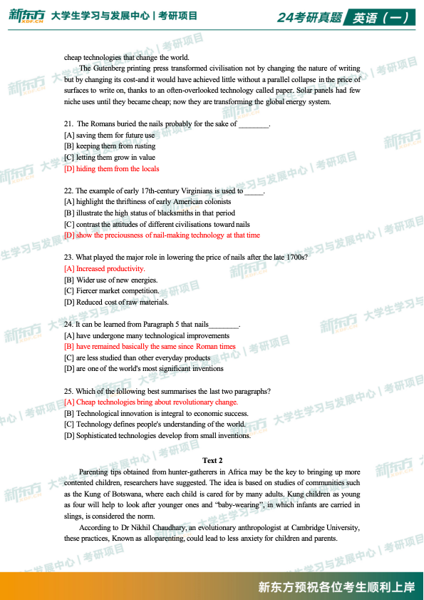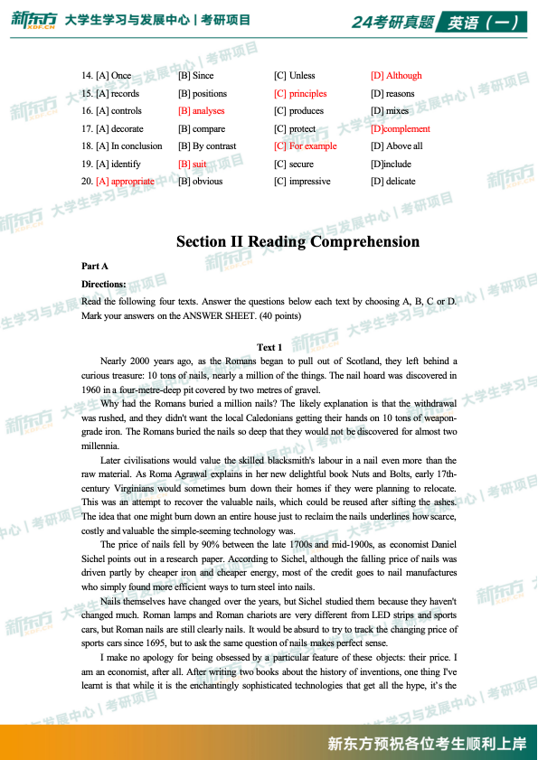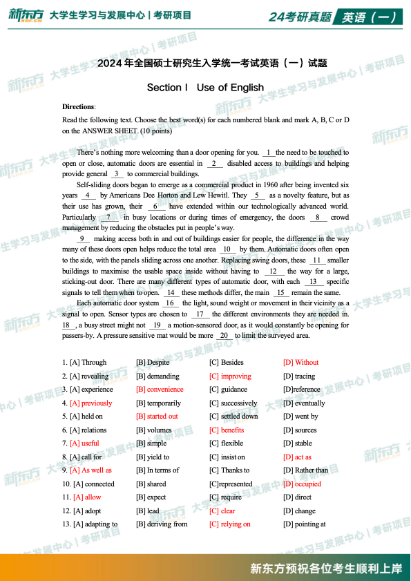 2024年全国硕士研究生招生考试英语(一)真题及解析完整版分享,备考2025年/2026年硕士研究生的考生,可以持续关注新东方考研网,为你提供天津高校历年考研资讯信息。
